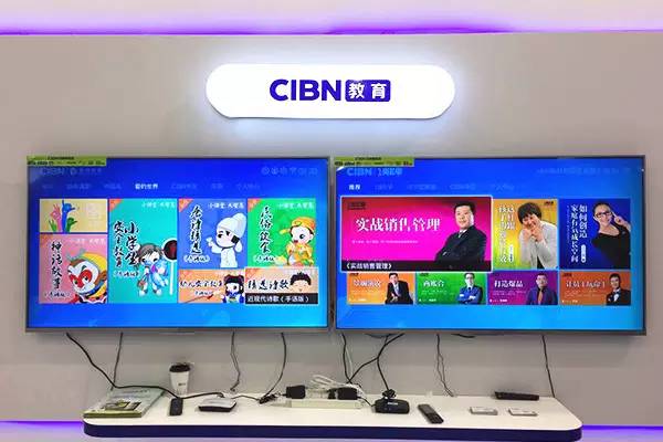 在第四届中国网络视听大会上展出的CIBN|唐颂少儿国学机顶盒,以及CIBN|1岗E学职业教育机顶盒