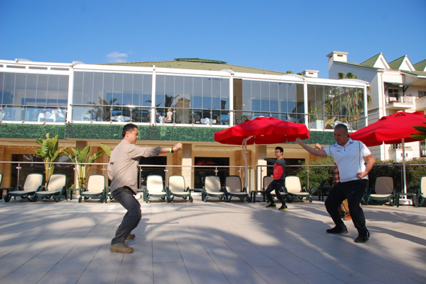 与土耳其外交部部长首席顾问晨练“八段锦”