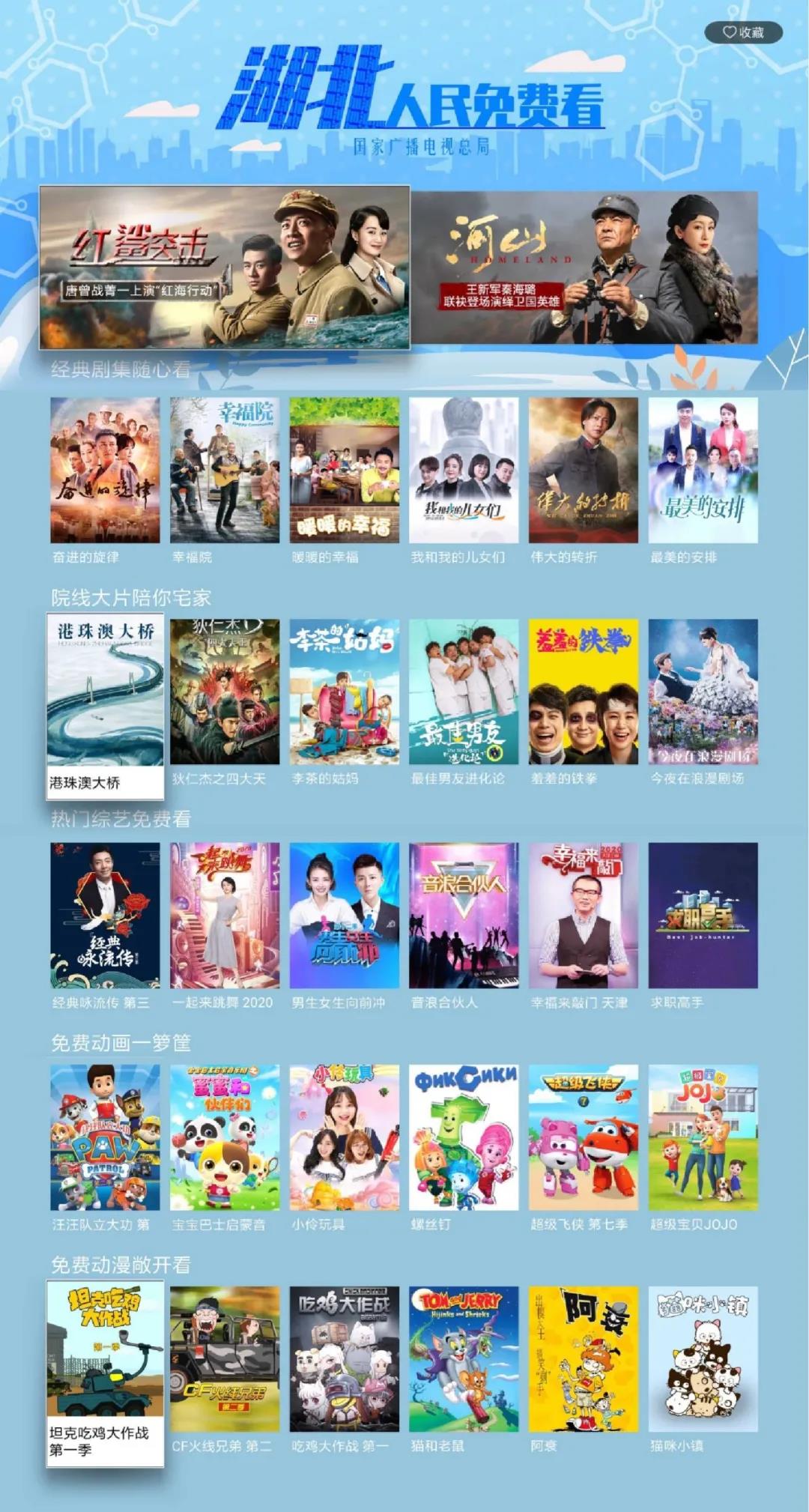 专区包含“经典剧集随心看”、“院线大片陪你宅家”、“热门综艺免费看”、“免费动画一箩筐”、“免费动漫敞开看”五个专题,内容丰富、品类繁多,针对不同年龄层次家庭成员精心搭配了节目套餐。其中,由秦海璐、王新军领衔主演的红色经典剧《河山》、谱写南疆热血颂歌的《红鲨突击》以及《暖暖的幸福》《伟大的转折》等经典剧集充满正能量,为湖北人民打气加油;经典动画《猫和老鼠》《小伶玩具》等热门动画和热血动漫专为小朋友准备,希望他们能够愉快地度过疫情时期;《经典咏流传》《一起来跳舞》等轻松愉快的综艺节目可满足不同类型观众需求,希望能够打造更贴心舒适的视听环境,为湖北人民舒缓压力。