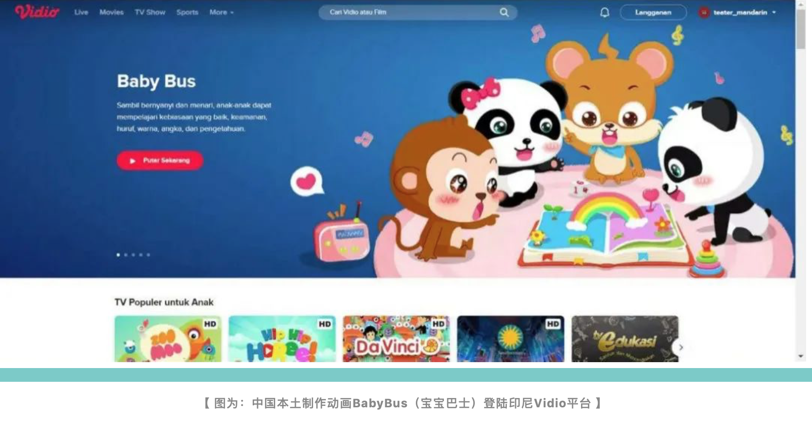 搭建海外传播平台,是实现优秀内容国际传播,进入本土主流社会的重要支撑。国广东方成功对接印尼本土流媒体平台Vidio,其月活跃用户达6000万。2020年8月,国广东方授权其播出印尼语版中国本土动画《宝宝巴士》(BabyBus)。截至目前,该片在Vidio平台观看量已超过1000万,长期位于该平台少儿类内容热门榜前三。