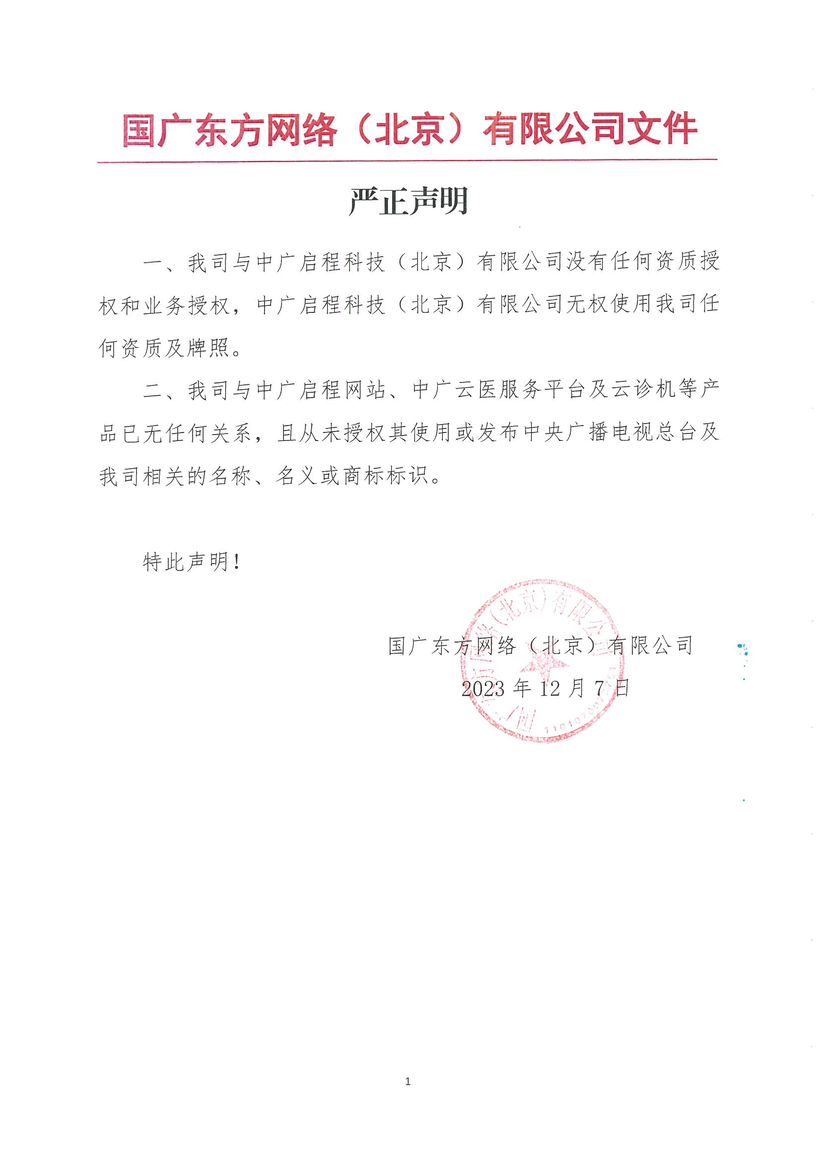 二、我司与中广启程网站、中广云医服务平台及云诊机等产品已无任何关系,且从未授权其使用或发布中央广播电视总台及我司相关的名称、名义或商标标识。