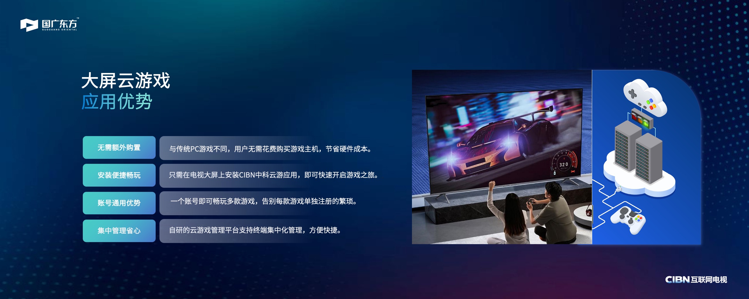通过“云主机+大屏电视”模式,云端算力视频流化平台把游戏从传统PC端移植到TV端,国广东方自主研发的集控集发管理平台实现了对终端的集中化管控,使服务更为便捷高效。