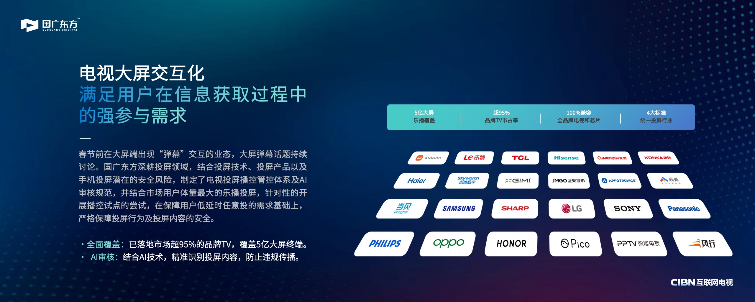针对投屏领域,国广东方制定了电视投屏播控管控体系及AI审核规范,并联合市场用户体量最大的乐播投屏针对性开展播控试点尝试,实现对投屏行为与内容安全的全流程管控。