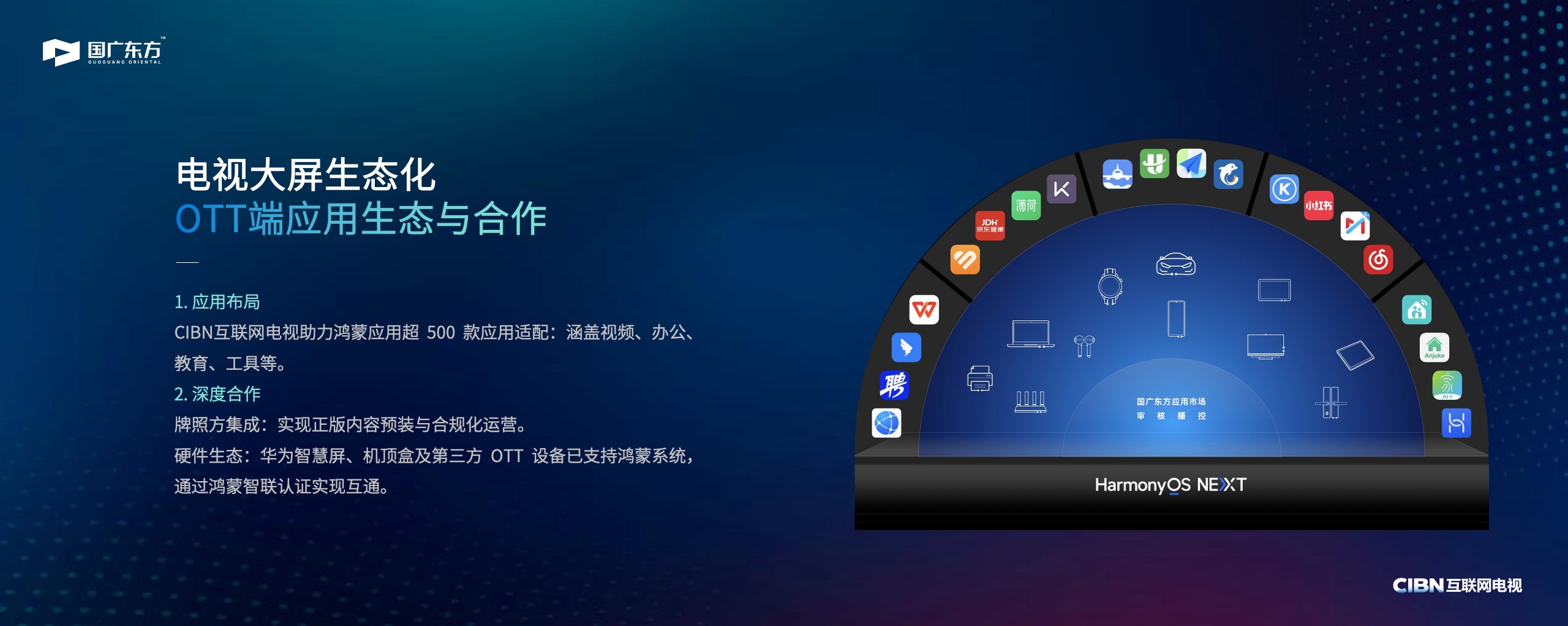 国广东方自主研发的应用审核播控机制在鸿蒙生态一体化中发挥了重要作用。基于鸿蒙系统技术底座,实现跨屏无缝协同、分布式硬件共享、人工智能应用。CIBN互联网电视牌照助力鸿蒙应用适配,在满足生态系统丰富性的同时,严格确保电视端业务安全。