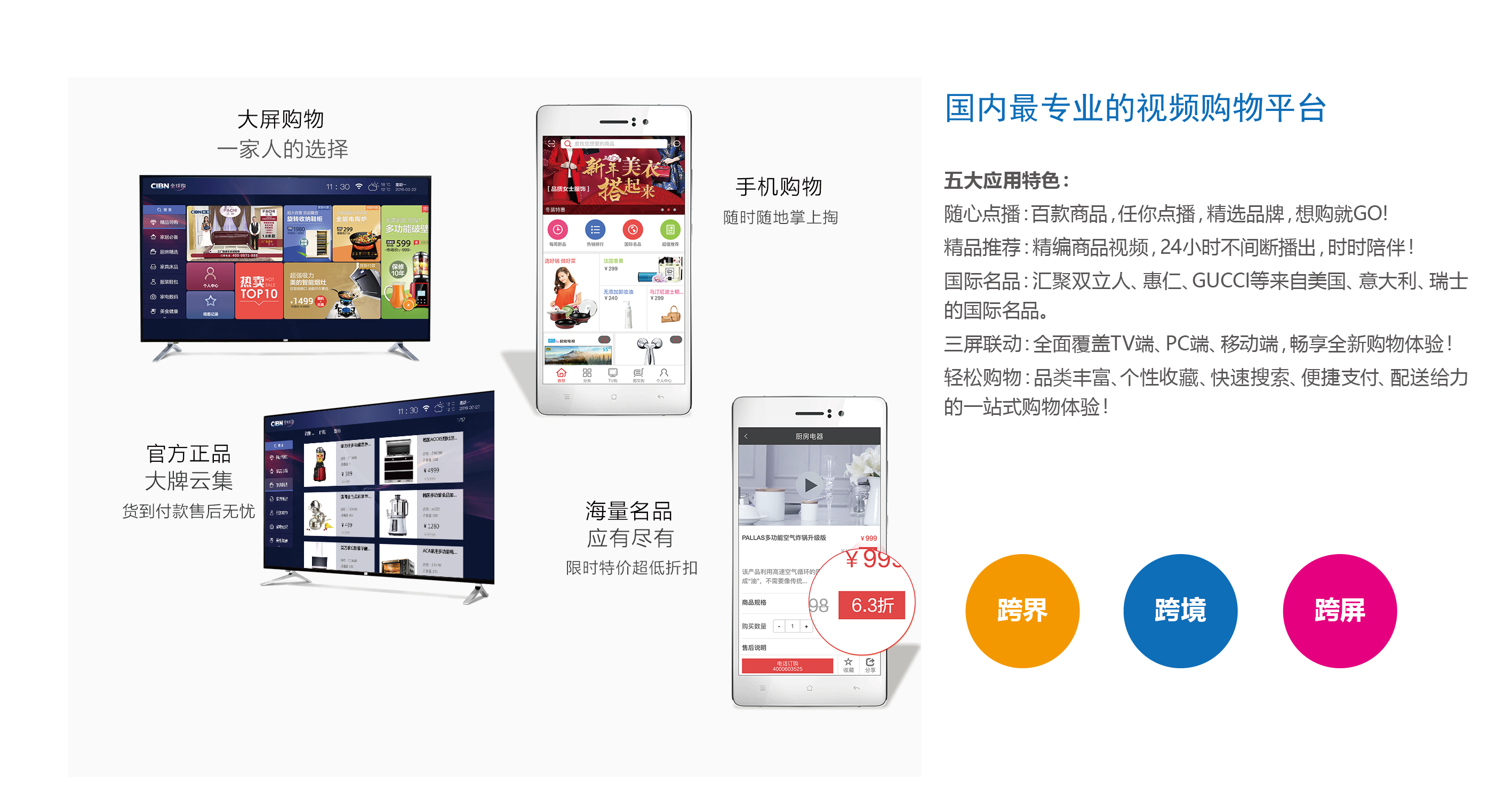 作为国内最大的家庭视频购物服务平台,CIBN全球购以跨界“传统电视购物与电子商务优势互补的创新模式”、跨境“以跨境电子商务模式将国际名品引入国内市场,国内名品推向全球”、跨屏“打通电视屏、电脑屏、手机屏,三屏联动,全屏覆盖”的全新业务模式及五大应用特色,在互联网电视购物领域独树一帜,带给消费者全新的大屏购物体验。