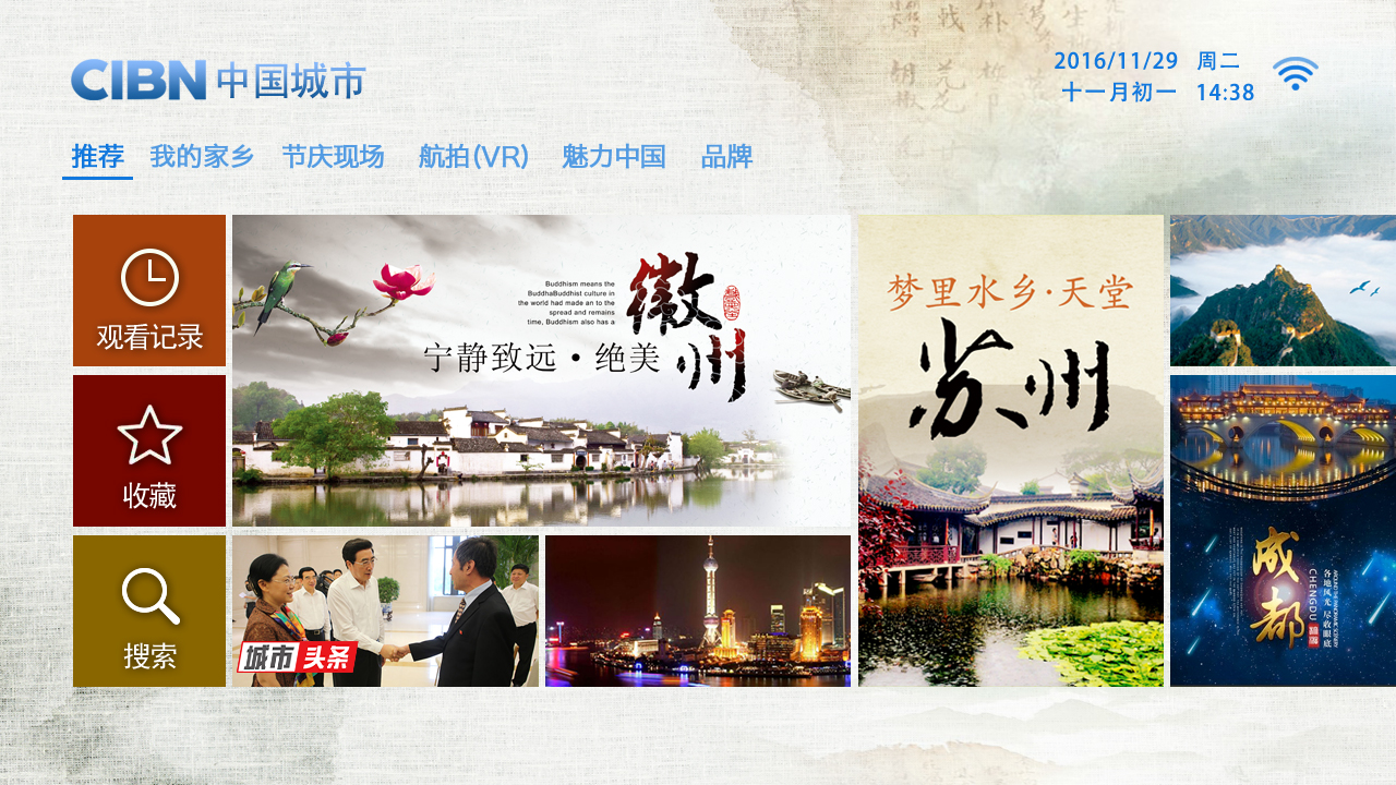 在《CIBN中国城市》——中国城市外宣推介平台上,将汇聚CIBN互联网电视所有与城市外宣有关的自制内容,包括转播、资讯、专题、纪录片、宣传片、微电影等。题材的定位是“讲述中国故事,传播中国声音”,主要包括以下内容:城市形象专区展示、节庆现场转播、航拍(VR)、城市文化、旅游资源、地标产品、地方经济等。