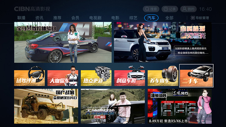 CIBN汽车,利用频道独特资源整合优势,汇聚时下最受关注的自媒体汽车大V视频节目、传统精品汽车电视节目,利用网络资源在第一时间播出报道全球最热门的汽车节目。带给车迷最震撼的大屏畅爽观看体验。